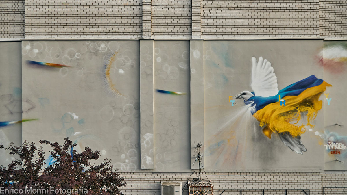 L’artista ha realizzato un imponente murale di oltre 12 metri per 6 metri su un edificio di fronte al Comune di Bucha dal titolo “Try-Fly”, una colomba che brilla di luce propria mentre spicca il volo, avvolta dalla bandiera ucraina; a incorniciare l’opera sono presenti, nello sfondo, rifrazioni di luce iridescenti che ricordano i colori della bandiera italiana.