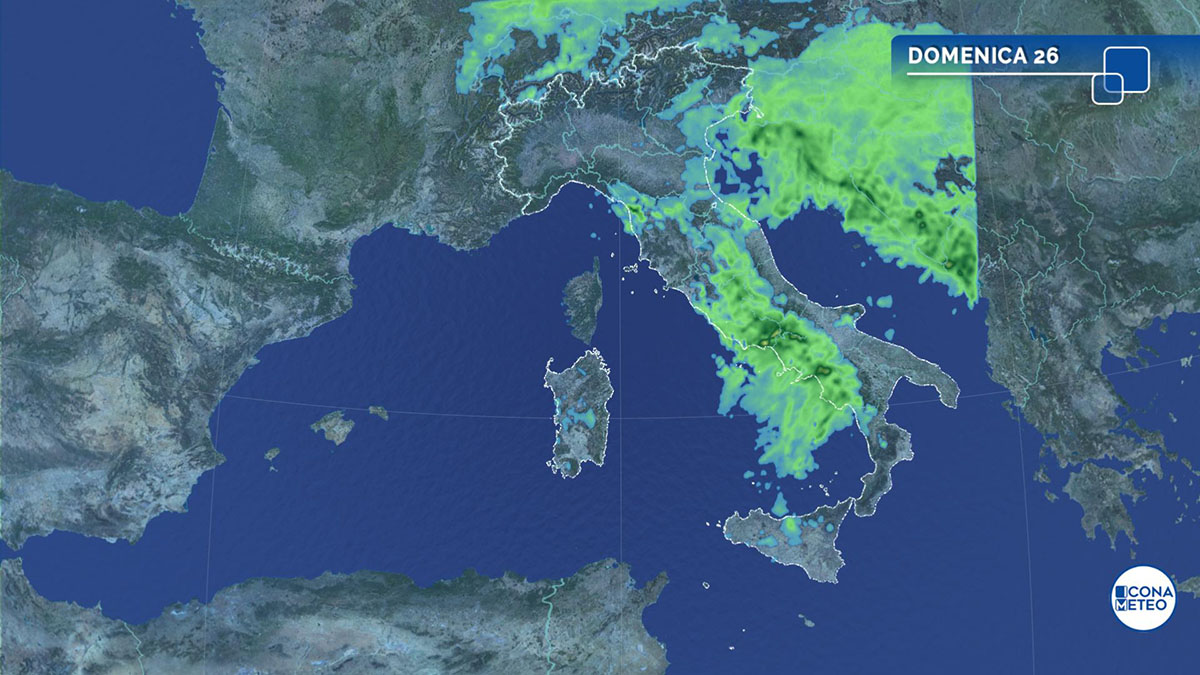 Piogge diffuse anche intense saranno possibili su Spezzino, Toscana, Lazio, Umbria, Appennino centrale, Campania. Precipitazioni diffuse ma più deboli su Sardegna, Emilia Romagna, Marche; piogge isolate sul basso Veneto, sulle regioni centrali adriatiche, verso sera in estensione fino sulla Puglia centro-settentrionale.