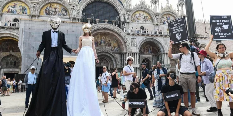 (Adnkronos) – Mentre continuano ad arrivare invitati celebri dagli Stati Uniti, non si fermano le proteste a Venezia per il matrimonio da mille e una notte tra Jeff Bezos e Lauren Sanchez. Oggi una ventina di attivisti di Extinction Rebellion hanno inscenato un flash mob di protesta contro le nozze di fronte alla Basilica di San Marco a Venezia. Due di loro sui trampoli vestiti da sposi rappresentavano la celebre coppia cui erano incatenati altri quattro testimoni dal nome di media, giustizia, governi e business. Due attivisti hanno provato ad arrampicarsi sui pennoni della piazza ma sono stati fermati dalla polizia.