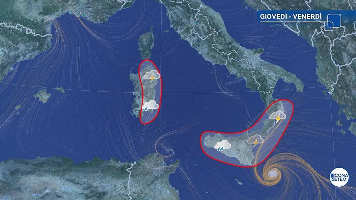 Cosa succederà in Italia? Vediamo l’evoluzione con il meteorologo Flavio Galbiati. Oggi il vortice ciclonico si allontanerà leggermente dal territorio italiano – spiega il meteorologo di IconaMeteo.it – concedendo una parziale e temporanea attenuazione del maltempo più estremo. Purtroppo lo scenario che si delinea per le giornate di giovedì e venerdì ci anticipa un nuovo deciso peggioramento perché il vortice tornerà a muoversi in direzione della Sicilia e diverrà ancora più intenso, con una maggiore energia e con la forma più tipica di un uragano con venti eccezionalmente forti in rotazione attorno a un vero e proprio occhio.