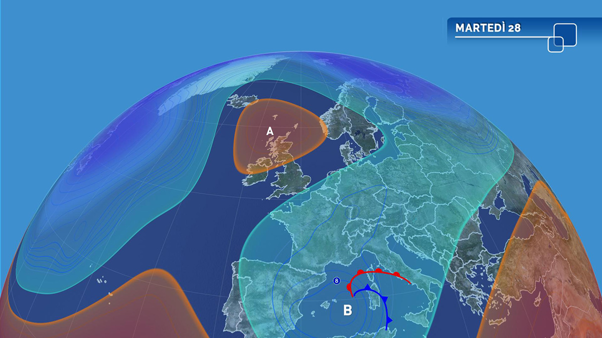 La circolazione di bassa pressione posizionata con il suo minimo depressionario in prossimità delle isole Baleari, nella seconda parte di martedì inizierà a muoversi lentamente verso est in direzione della Sardegna che raggiungerà nella giornata di mercoledì; poi giovedì avrà raggiunto il Mar Tirreno dove con buona probabilità insisterà anche nella giornata di venerdì. Questa evoluzione si tradurrà in nuove precipitazioni al centro-sud, a tratti e localmente anche intense, con nevicate in Appennino solo a quote medio alte.
