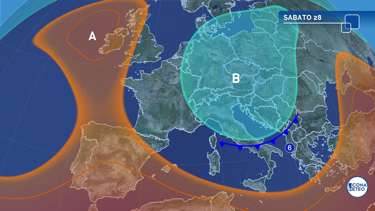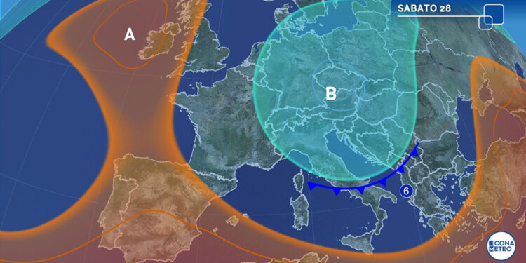La circolazione ciclonica centrata sull’Europa centrale in corrispondenza della Repubblica Ceca, che contiene al suo interno un nucleo di aria fredda, si sta spostando leggermente e lentamente verso sud-est influenzando così marginalmente anche la nostra penisola. Le temperature, che al Nord sono già diminuite, si stanno abbassando anche sulle regioni centrali e su parte di quelle del Sud. Il transito di questa struttura sarà accompagnato anche da qualche rovescio di pioggia, specie sulle regioni nord-orientali e su quelle centrali adriatiche.
