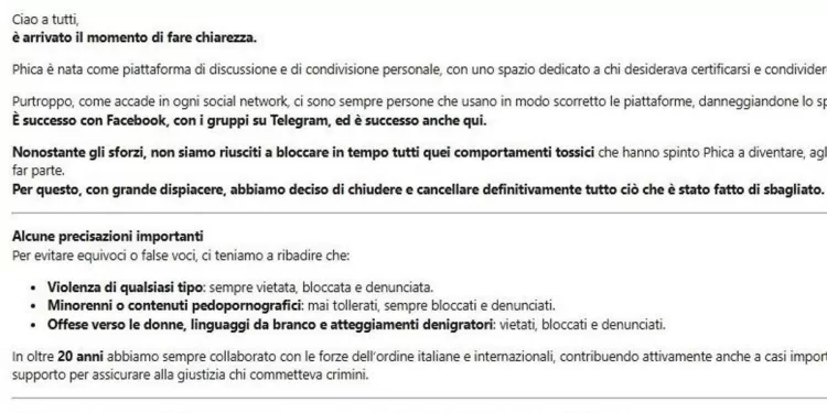 ”Alcune precisazioni importanti Per evitare equivoci o false voci, ci teniamo a ribadire che: Violenza di qualsiasi tipo: sempre vietata, bloccata e denunciata. Minorenni o contenuti pedopornografici: mai tollerati, sempre bloccati e denunciati. Offese verso le donne, linguaggi da branco e atteggiamenti denigratori: vietati, bloccati e denunciati. In oltre 20 anni abbiamo sempre collaborato con le forze dell’ordine italiane e internazionali, contribuendo attivamente anche a casi importanti (come quello seguito dal giudice Cantone), fornendo ogni volta dati e supporto per assicurare alla giustizia chi commetteva crimini. Phica è stata una comunità, con luci e ombre, ma soprattutto con la volontà di creare uno spazio diverso. Vi ringraziamo per averne fatto parte”.