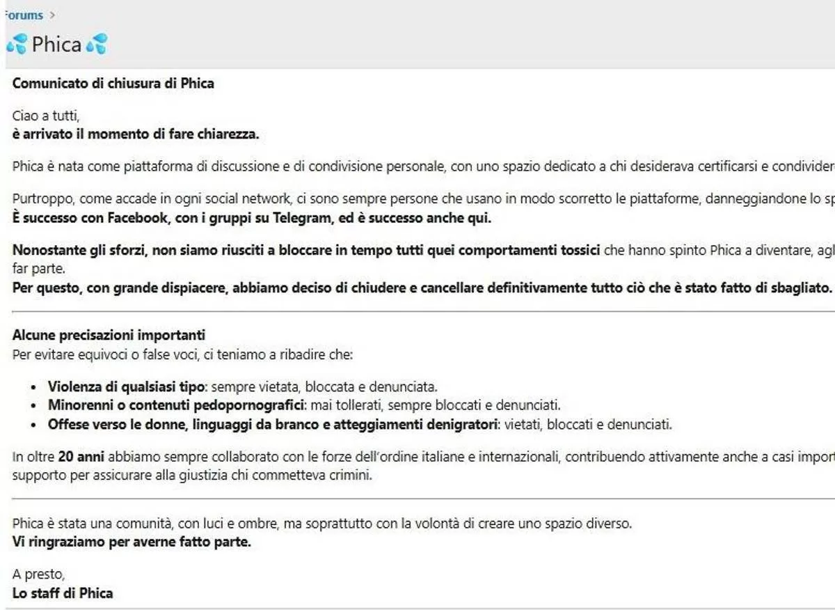 ”Alcune precisazioni importanti Per evitare equivoci o false voci, ci teniamo a ribadire che: Violenza di qualsiasi tipo: sempre vietata, bloccata e denunciata. Minorenni o contenuti pedopornografici: mai tollerati, sempre bloccati e denunciati. Offese verso le donne, linguaggi da branco e atteggiamenti denigratori: vietati, bloccati e denunciati. In oltre 20 anni abbiamo sempre collaborato con le forze dell’ordine italiane e internazionali, contribuendo attivamente anche a casi importanti (come quello seguito dal giudice Cantone), fornendo ogni volta dati e supporto per assicurare alla giustizia chi commetteva crimini. Phica è stata una comunità, con luci e ombre, ma soprattutto con la volontà di creare uno spazio diverso. Vi ringraziamo per averne fatto parte”.