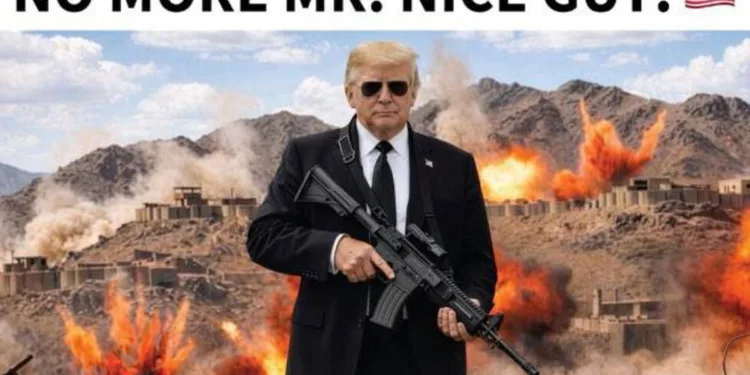 Donal Trump con la mitragliatrice in mano, sullo sfondo di un paesaggio devastato da bombardamenti. E’ l’immagine dai toni forti che accompagna l’ultimo avvertertimento del presidente Usa all’Iran. Il regime “non riesce a darsi una mossa. Non sanno come firmare un accordo non-nucleare. Farebbe bene a svegliarsi presto”, scrive Trump in un post su Truth con allegato un fotomontaggio — apparentemente generato con intelligenza artificiale — che lo ritrarre occhiali da sole indossati, fucile mitragliatore imbracciato davanti a una catena montuosa sconvolta da esplosioni e scenari di guerra.