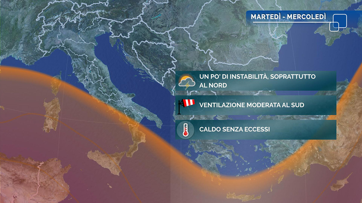 Temperature senza grosse variazioni, sempre su valori estivi, con massime quasi ovunque comprese tra 27 e 32 gradi. Venti deboli, salvo rinforzi da est-sudest nei canali delle Isole e nelle aree temporalesche. Mari: generalmente calmi o poco mossi.