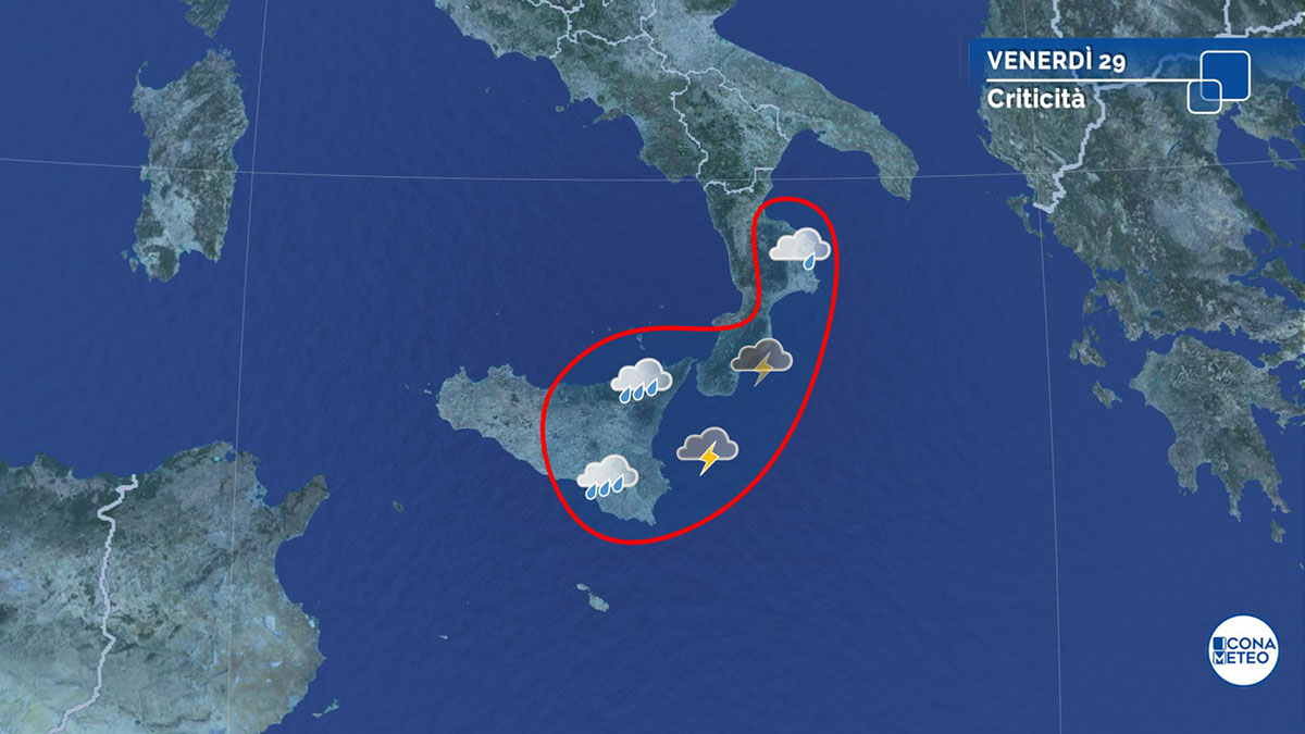 Sulla Calabria e in Sicilia giornata di marcato maltempo con cielo molto nuvoloso o coperto e numerose piogge. Piogge intense o forti rovesci, anche temporaleschi, interesseranno soprattutto il settore ionico della Calabria e le zone orientali dell’isola con il rischio di locali nubifragi e conseguenti criticità.