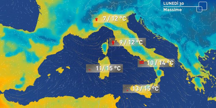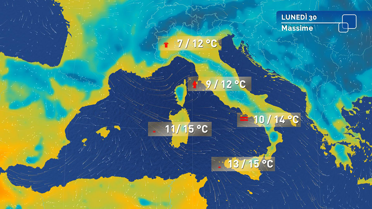 Temperature minime in calo al Sud e nelle Isole, per lo più in rialzo al Centronord ma con ancora possibili gelate a bassa quota. Massime stabili o in leggero rialzo con valori nella norma o leggermente al di sopra. Venti di Maestrale da moderato a forte sul mare e Canale di Sardegna; venti deboli o moderati occidentali nel Canale di Sicilia, settentrionali sullo Ionio al largo; generalmente deboli altrove. Mari: mossi o molto mossi il mare di Sardegna, i Canali delle Isole e lo Ionio; per lo più calmi o poco mossi i restanti bacini.