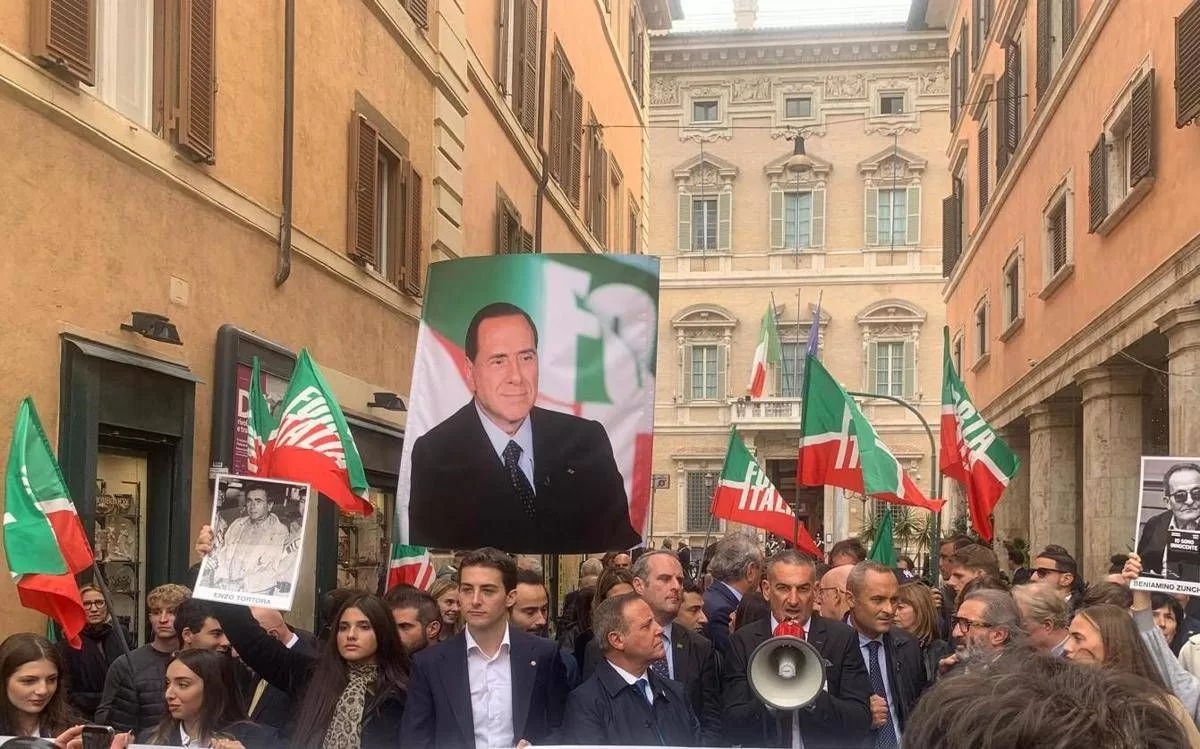 Oltre a un maxi striscione con il volto di Berlusconi, Forza Italia ha portato in piazza anche una foto, più piccola e in bianco e nero, di Enzo Tortora. Tra i manifestanti anche alcune vittime di errori giudiziari.