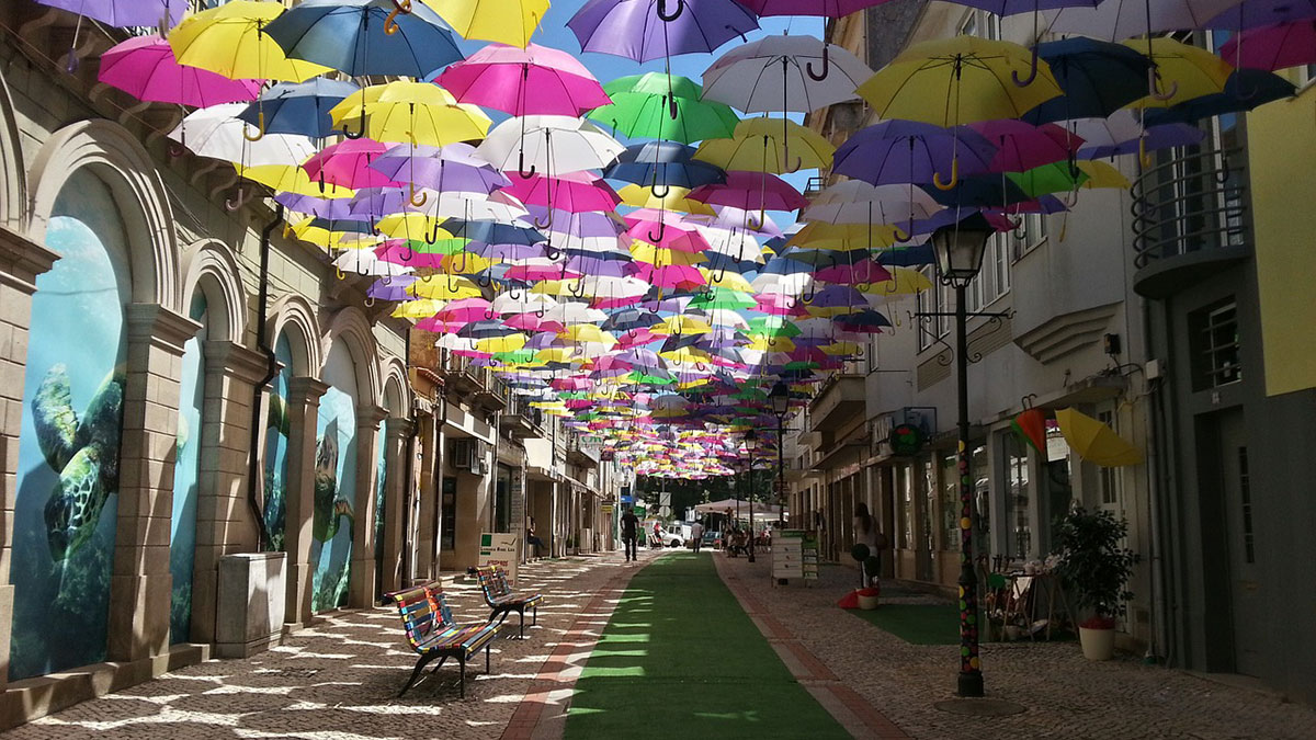 La svolta è arrivata nel 2011, quando una società creativa locale, la Sexta Feira, ha avuto il colpo di genio di installare oltre tremila ombrelli tramite cavi sospesi in aria per le strade del centro, in occasione del ÁgitÁgueda Art Festival che si tiene ogni anno a luglio.