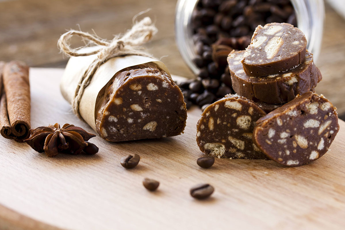 Non particolarmente difficile da preparare e molto amato, soprattutto dai bambini, è il salame di cioccolato. Di solito gli ingredienti per prepararlo sono cioccolato, biscotti secchi, burro, uova e zucchero. Si comincia sbriciolando in un recipiente i biscotti secchi, si aggiungono poi il cioccolato fuso, il cacao amaro, lo zucchero, le uova e il burro fuso. Amalgamando tutti gli ingredienti si ottiene un impasto che va disposto su un foglio di carta argentata che andrà poi chiusa in modo da ottenere la forma di un salame, modellandola con le mani. Una volta fatto raffreddare il composto, basterà farlo rassodare in frigorifero per almeno 2 ore, appena sarà freddo non ci sarà altro da fare che spolverizzarlo con dello zucchero a velo, tagliarlo a fettine, e servirlo.