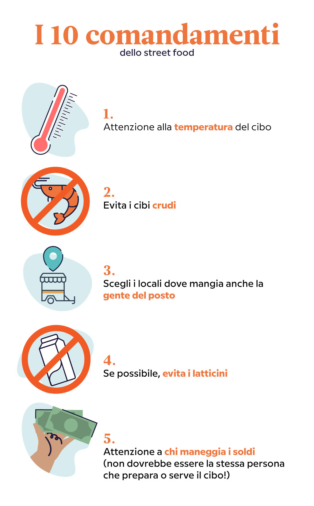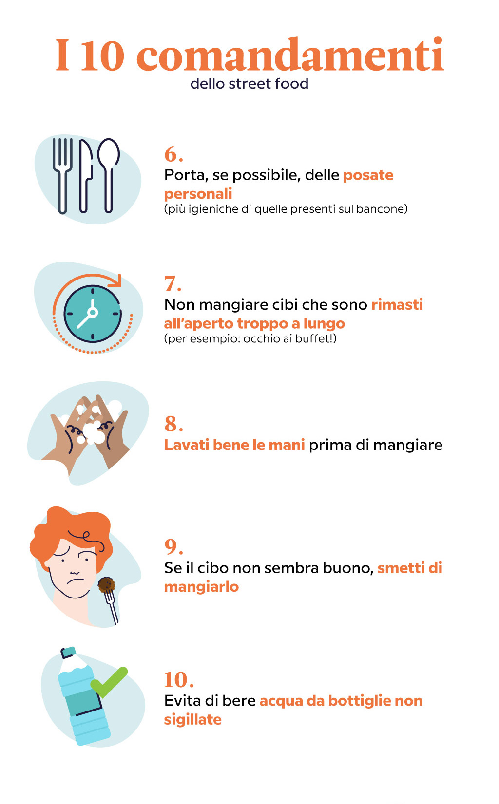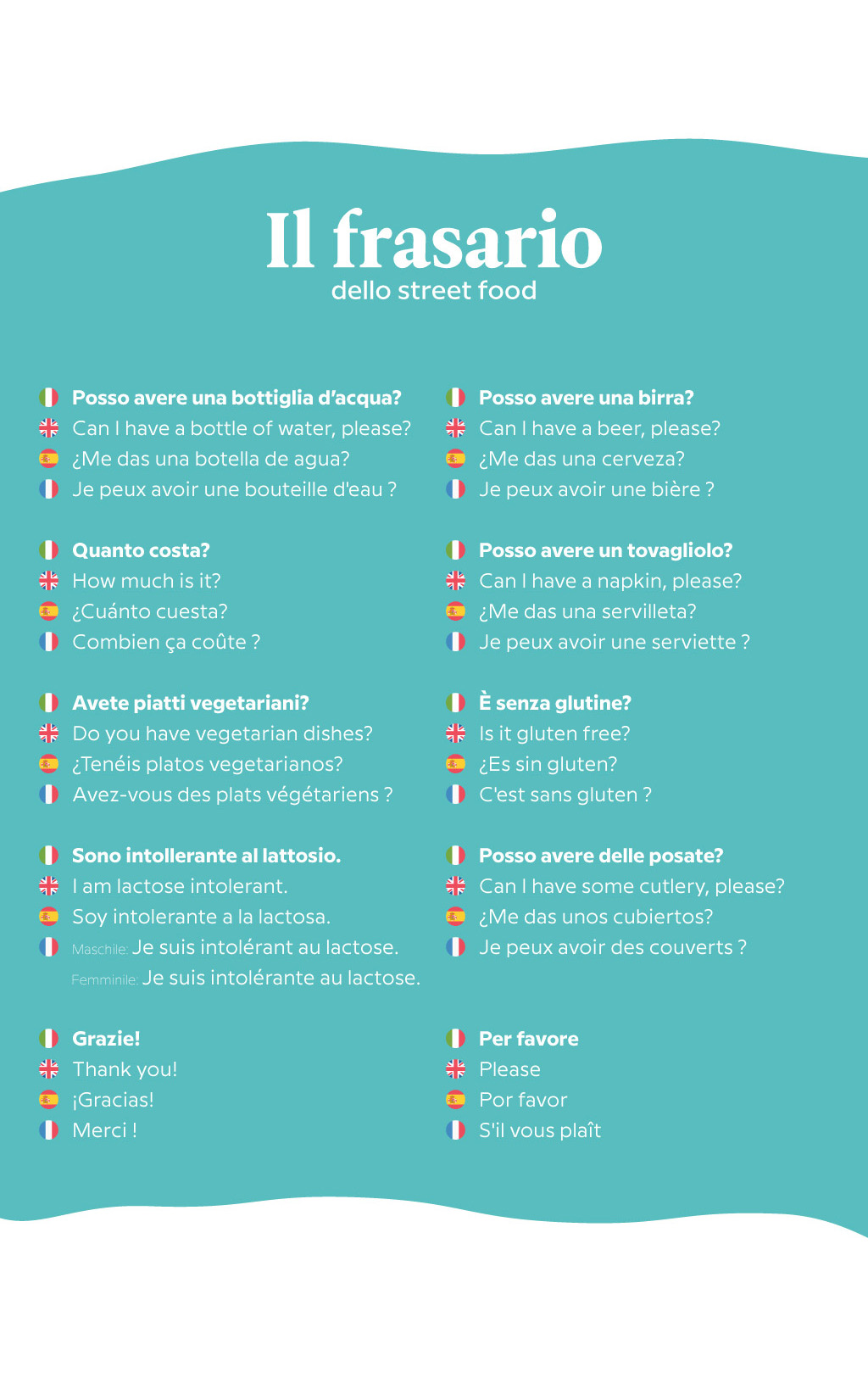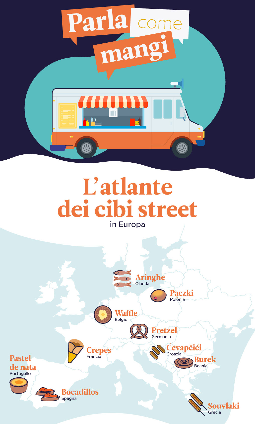 Nell’infografica si trovano poi diversi consigli per gustare questi cibi in totale sicurezza, e un frasario in diverse lingue straniere dedicato proprio allo street food, per ordinare i cibi nelle varie località europee non appena sarà possibile visitarle in piena tranquillità.