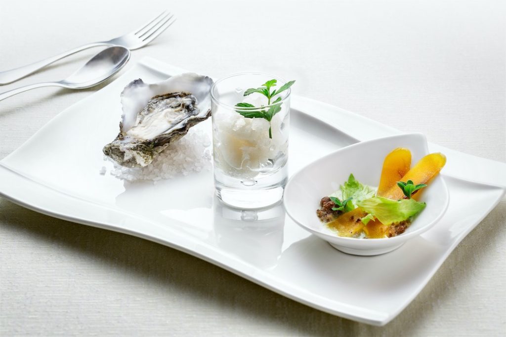 Preparazione: Aprire le ostriche con il coltello apposito, condire con un’emulsione di olio e limone e tenere da parte. Tagliare a fette sottili il cuore del sedano, la parte più tenera, e condire con olio extra vergine di oliva e qualche goccia di limone, tagliare la bottarga a lamelle. Creare uno sciroppo con l’acqua e lo zucchero e mettere in infuso la melissa, abbattere a -18°C e grattare con una forchetta. Adagiare l’ostrica nel piatto di portata, il sedano con sopra la bottarga a lamelle e servire la granita in un bicchierino di vetro decorando con la foglia di melissa.