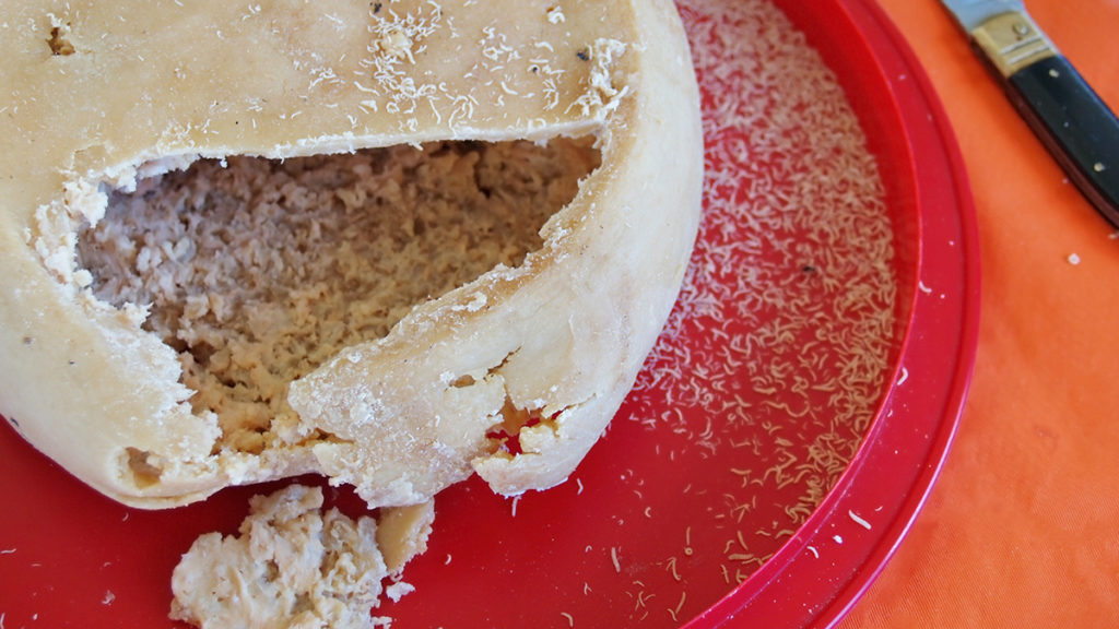 Verosimilmente questo formaggio è nato per errore, lasciato alla mercé delle mosche da un pastore distratto o troppo impegnato, ma i sardi proteggono con impegno e solennità tutto ciò che li riguarda e, per facilitare questo processo, negli anni hanno creato dei trucchi che ne favorissero la produzione: oltre ad accorciare i tempi destinati alla salamoia, si scavano dei buchi sulla calotta della forma di formaggio, all’interno dei quali viene versato olio in modo che la crosta si ammorbidisca e attiri gli insetti più velocemente. Quando il formaggio ha raggiunto il giusto stadio di fermentazione, la forma viene aperta togliendo la parte superiore, altrimenti chiamata su tappu.