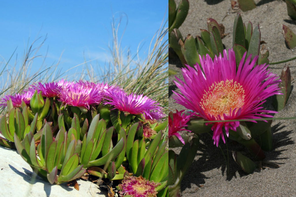 Il fico degli ottentotti è una specie originaria del Sudafrica. Coltivata da noi per scopi ornamentali o per stabilizzare le dune costiere ma spontaneizzata in molte zone litorali della Sardegna. Malgrado l’aspetto ornamentale e la bellezza dei fiori, la sua crescita molto veloce e il potere coprente che esercitano i sui fusti rendono questa pianta molto dannosa per i delicati ecosistemi dunali.