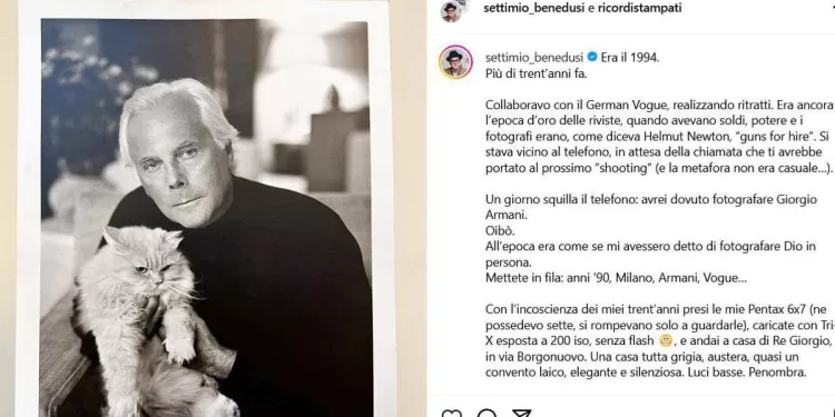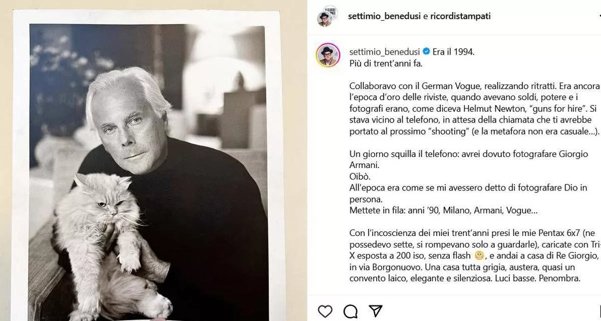 “Entrare in quel luogo era come entrare in un convento laico: tutto grigio, luci basse, silenzio. Un posto molto Armani” racconta Benedusi. Il servizio prevedeva un ritratto con il gatto di Re Giorgio ma non fu semplice: “Il gatto non voleva stare in braccio a lui e lui non voleva tenerlo. I peli bianchi sulla maglia nera erano un problema. Non c’era Photoshop. Non esisteva il ‘poi sistemiamo in post’”. Nonostante le difficoltà, il servizio riuscì e fu pubblicato sulle pagine di Vogue. “Armani aveva un carisma enorme. Era gentile ma incuteva rispetto solo per quello che rappresentava. Qualsiasi cosa passasse dalle sue mani diventava Armani: una camicia bianca, una foto, un’immagine”.