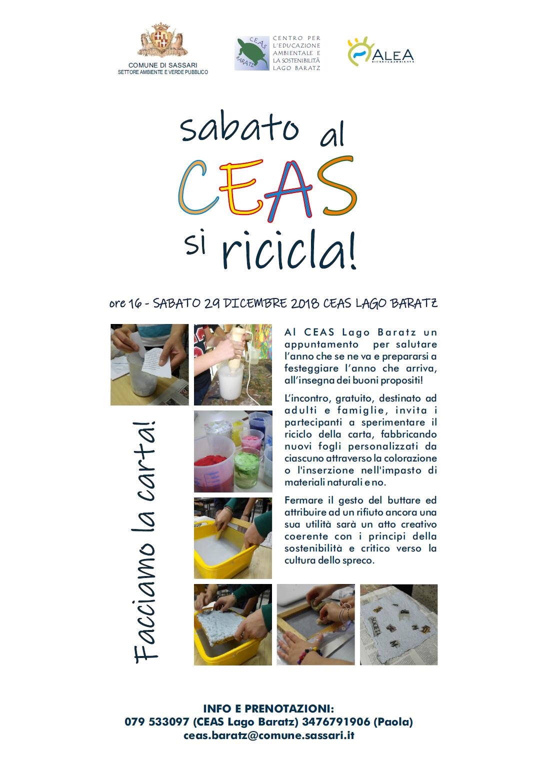 Al Ceas Lago Baratz si saluta il 2018 con un appuntamento tutto dedicato al riciclo e al rispetto per l’ambiente. Sabato 29 dicembre alle 16 si terrà un laboratorio dedicato a bambini, bambine, famiglie e a quanti desiderano cimentarsi nel progetto di riciclo organizzato dal Comune di Sassari e dalla associazione Alea “Facciamo la carta”.