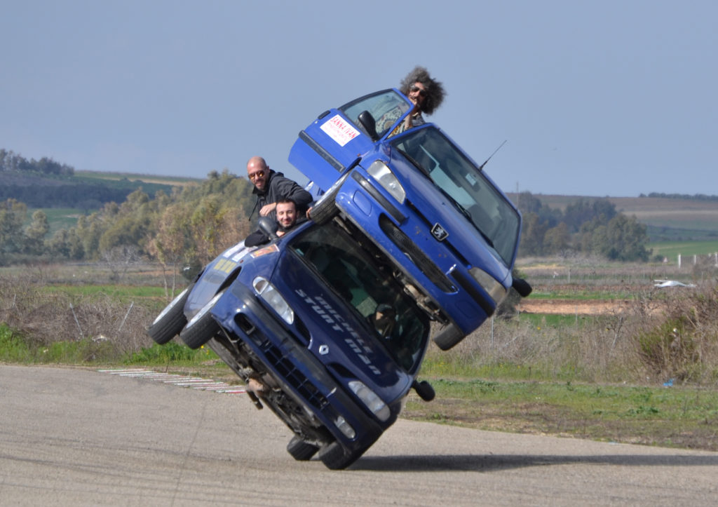 Per alcuni automezzi occorre usare una rampa che favorisca l’inclinazione, per altri non occorre. Diversi veicoli come i fuoristrada o gli autocarri riesco a sollevarli senza l’ausilio della rampa. Per fare questo sfrutto la prima legge di Newton: in pratica, mentre i mezzi più alti riesco a inclinarli senza la rampa perché hanno il baricentro più alto, per le vetture serve un trampolino, essendo mezzi più bassi. La macchina viene lanciata a una certa velocità e una volta sollevata si deve giocare con acceleratore e volante per tenerla in equilibrio. È una questione di pratica, ci vogliono ore e ore di allenamento per poter arrivare a tenere la macchina nel suo punto di equilibrio che non la faccia tornare giù, in un verso o nell’altro.