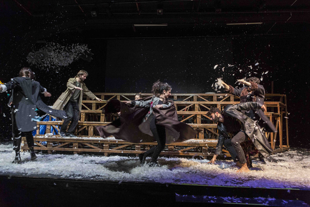 Sotto i riflettori Camilla Barbarito, Maria Giuditta Costantini, Nicolas Errico, Daniele Gaggianesi, Claudio Pellegrini, Claudio Pellerito, Giulia Perosa, Chiara Serangeli e Fabio Zulli: una compagnia di giovani attori per la divertente commedia ispirata alla nostalgia di una remota “età dell’oro” «quando gli uccelli, più antichi di Crono e dei Titani, padroni del tempo, erano sovrani di una patria dolce e materna, senza leggi né violenza». La pièce con le scenografie di Lucia Rho, i costumi di Pamela Aicardi e il disegno luci di Mario Loprevite, è impreziosita dagli inserti e dagli effetti del teatro d’ombra a cura della Compagnia Controluce, in un’intrigante contaminazione di linguaggi e stili per dar corpo alla dimensione fantastica di una “fiaba” tra ironia e poesia.