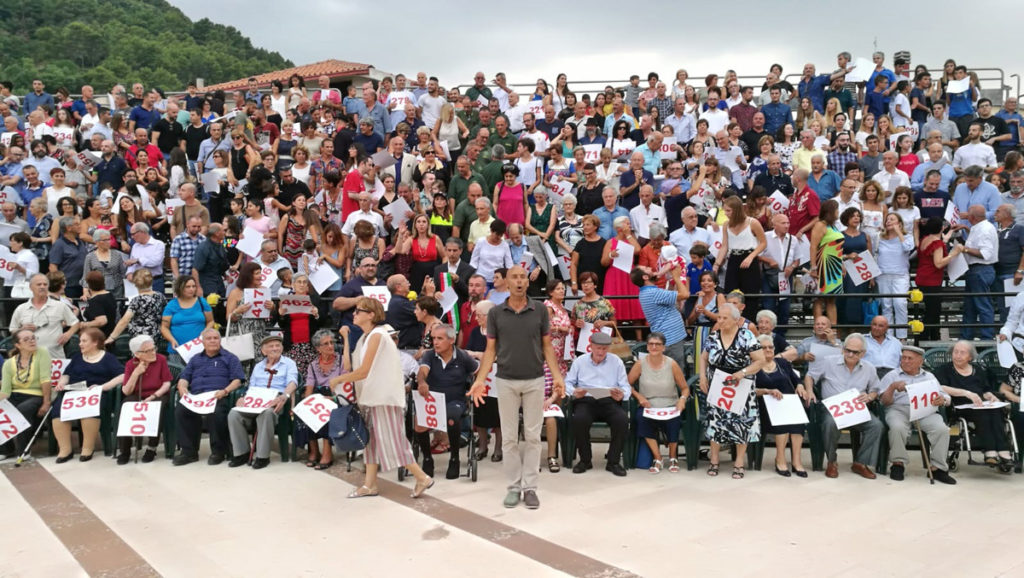 Banari è nella storia. Il piccolo paese della provincia di Sassari, nel Nord Sardegna, ricorderà a lungo questa data: 4 agosto 2018. Ieri sera la centralissima piazza San Giacomo è stata teatro di “Il ritratto di gruppo più grande del mondo”. È la fotografia più grande mai dedicata a una comunità locale. Nessuno aveva mai messo insieme tutti gli abitanti di un paese per uno scatto del genere. Grazie al click del fotografo Marco Ceraglia, Banari aspira a entrare nel libro dei record: la documentazione passerà al vaglio del Guinnes dei primati. Ma al di là di quella certificazione, il paese da oggi sarà ricordato per un primato originale: i suoi abitanti, praticamente tutti, oggi hanno partecipato allo scatto di portata storica. E i residenti che non hanno potuto prendere parte all’evento sono stati compensati dai tantissimi banaresi che vivono in altre parti dell’isola, o oltre Tirreno, se non addirittura in terre lontane. Come Aurelio Piu, 78 anni, da 52 emigrato a Greenwich, nel Connecticut, Stati Uniti d’America, che non ha voluto mancare l’appuntamento con la storia. Vestito di tutto punto, commosso, ha baciato la pavimentazione della piazza, ha preso il suo numero e si è diligentemente messo in posa nella tribuna in cui – tra amministratori, autorità civili e religiose, attori culturali, sociali, economici e sociali – alla fine erano in 570. In primissima fila Diego Cordedda, 96 anni, il più anziano dei figuranti, in possa tra la moglie Gerolama Pais, 89 anni, e la figlia, Michelina Cordedda.