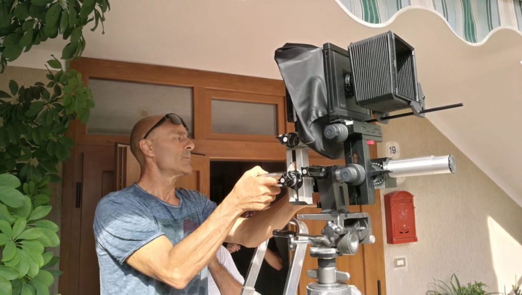 Per allestire il set di piazza San Giacomo, è stata realizzata un’arena leggermente curva, 27 metri di lunghezza per 6 metri di profondità, sviluppata in altezza grazie alla realizzazione di 10 gradoni. La postazione fotografica è stata allestita su un piano rialzato a circa 3 metri da terra, sul terrazzino di una casa privata, contenente due apparati principali di ripresa: un apparecchio analogico a banco ottico Sinar, che ha lavroato con delle lastre per il negativo a colori di formato 4×5”, e un apparato digitale che ha il suo cuore nella prestigiosa Hasselblad H6D 100, portata a Banari e gestita dallo sponsor tecnico della manifestazione. Si tratta di Giuseppe Friuli, responsabile di DGtales, importatore italiano di questo tipo di apparecchi, un dorso digitale di medio formato, appena uscito sul mercato della casa più blasonata al mondo. Gli addetti hanno accolto i partecipanti e li hanno guidati alla loro postazione dopo averli registrati e numerati.