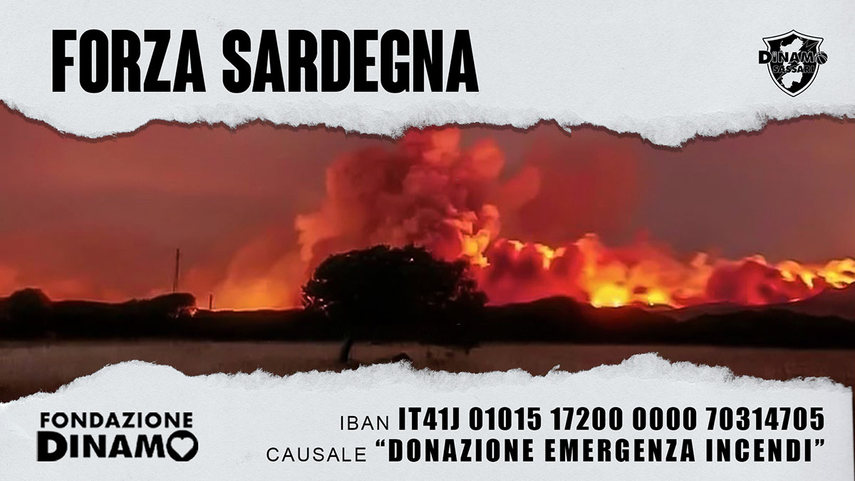 La Dinamo Banco di Sardegna e la Fondazione Dinamo hanno lanciato una settimana fa la campagna di raccolta fondi in favore delle popolazioni duramente colpite dagli incendi che hanno distrutto oltre 20mila ettari di terreno, aziende agricole e attività commerciali.