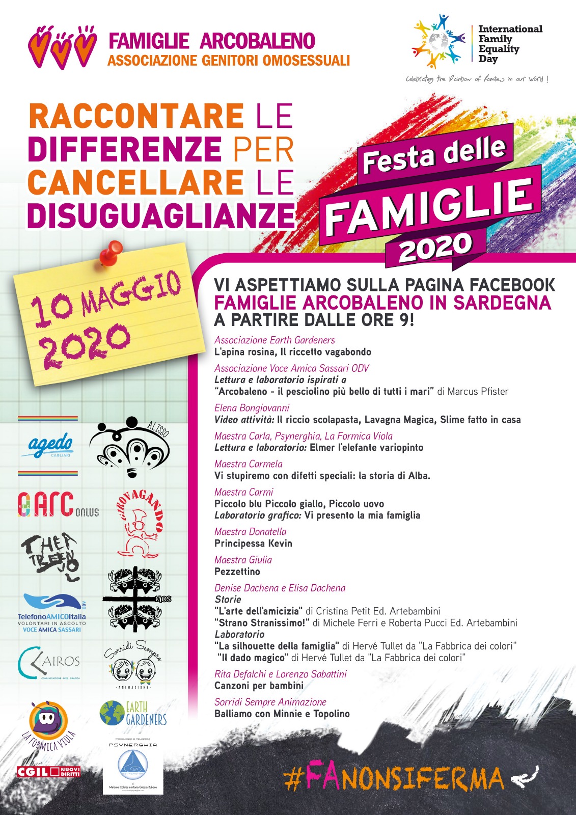 La Festa delle Famiglie in Sardegna. Era tutto organizzato da mesi affinché La festa delle famiglie in Sardegna si svolgesse il 10 maggio in un parco di Sassari. Anche se gli eventi non lo hanno reso possibile, il gruppo sardo ha deciso di non fermarsi e in sinergia con diverse associazioni sul territorio (MOS, ARC, AGEDO, Voce Amica Sassari ODV, Earth Gardeners, Theatre en vol, Girovagando, La Formica Viola, CGIL Nuovi Diritti, Alisso e Psynergia) offrirà, nella giornata di domenica, un nutrito catalogo di appuntamenti per tutti i gusti: laboratori creativi, musicali, di ballo e sulla natura e ancora letture a tema e teatro kamishibai che saranno tenuti da maestre della scuola dell’infanzia e primaria, da un’assistente sociale e un’ostetrica, da esperti della natura, musicisti e tanti volontari che si sono offerti con entusiasmo. Per tutta la giornata, sulla pagina Facebook Famiglie Arcobaleno in Sardegna sarà possibile visionare i video con le attività dedicate alle famiglie di ogni colore e forma.