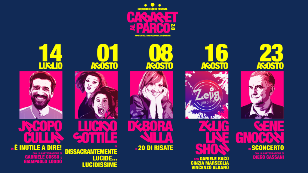 Ci sarà da ridere, questa estate, a Sarroch: in cinque serate, tra il 14 luglio e il 23 agosto, ritorna a distanza di dodici anni Cabaret al Parco, la rassegna dedicata alla comicità che ha tenuto banco dal 2002 al 2007; un appuntamento divenuto subito di successo, e che nell’arco di sei edizioni ha portato nella cittadina costiera sul golfo di Cagliari nomi del calibro di Paolo Rossi, Antonio Albanese, Maurizio Crozza, Ficarra e Picone, Giobbe Covatta, Enrico Bertolino, Dario Vergassola, tra gli altri, non senza dare il giusto spazio ai talenti sardi, come i Lapola, Pino e gli anticorpi, BAZ.