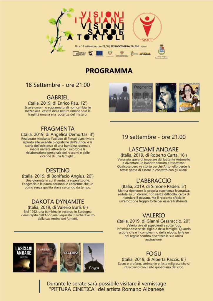 Due serate a tutto cinema a Tortolì. Il 18 e 19 settembre 2020 alle ore 21:00 l’Ex Blocchiera Falchi in via Eleonora d’Arborea sarà il palcoscenico di due serate dedicate alle nuove opere cinematografiche proposte dalla rassegna “Visioni Sarde”. L’evento è organizzato dall’Associazione Culturale Sĭmul con la cura dell’art director Antonio Ghironi, regista, attore teatrale, sceneggiatore e videomaker.