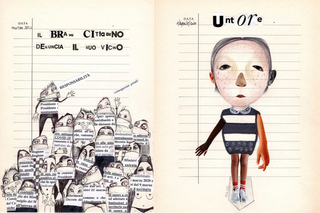 La pittura visiva come arte capace di comunicare e indurre alla riflessione. Laura Saddi ricorre a diverse tecniche per ottenere tale scopo, poiché convinta che l’arte sia anche “comunicazione” e, di conseguenza «più modi conosciamo per comunicare e più alta è la probabilità di arrivare a chi ci interessa». Appassionata di disegno sin da bambina, i fogli di carta hanno rappresentato per lei l’unico posto in cui sentirsi libera, sui quali raccontare storie e costruire un mondo che la rassicurasse. Il mondo di Laura è costituito da una stregua variegata di messaggi che riescono a colpire per il loro forte impatto visivo, obbligandoci a cercare di risolvere un enigma al quale sembra voglia sottoporci. Ha una produzione frenetica, è un fiume in piena di idee e progetti. Navigando tra le sue opere, ci si trova a fantasticare osservando i collage realizzati per il progetto “Adesso. In sospeso”, lanciato da Annarita Punzo e Giuseppe Serra i quali, durante il lockdown della scorsa primavera, hanno invitato una rosa di artisti a condividere nella relativa pagina Facebook i lavori realizzati o attinenti a quel periodo. Partecipa con “Diario di quarantena”, una serie di immagini realizzate con una tecnica mista: collage di giornali e autocertificazioni in vigore durante quel periodo. «Durante la quarantena ho realizzato delle illustrazioni in cui ho espresso sensazioni ed emozioni del momento – spiega –. La carta che ho utilizzato è l’ultima pagina dedicata alle note di una piccola enciclopedia del ’68 e, solo negli ultimi due lavori, la pagina di rilegatura di un’enciclopedia medica del 1980».