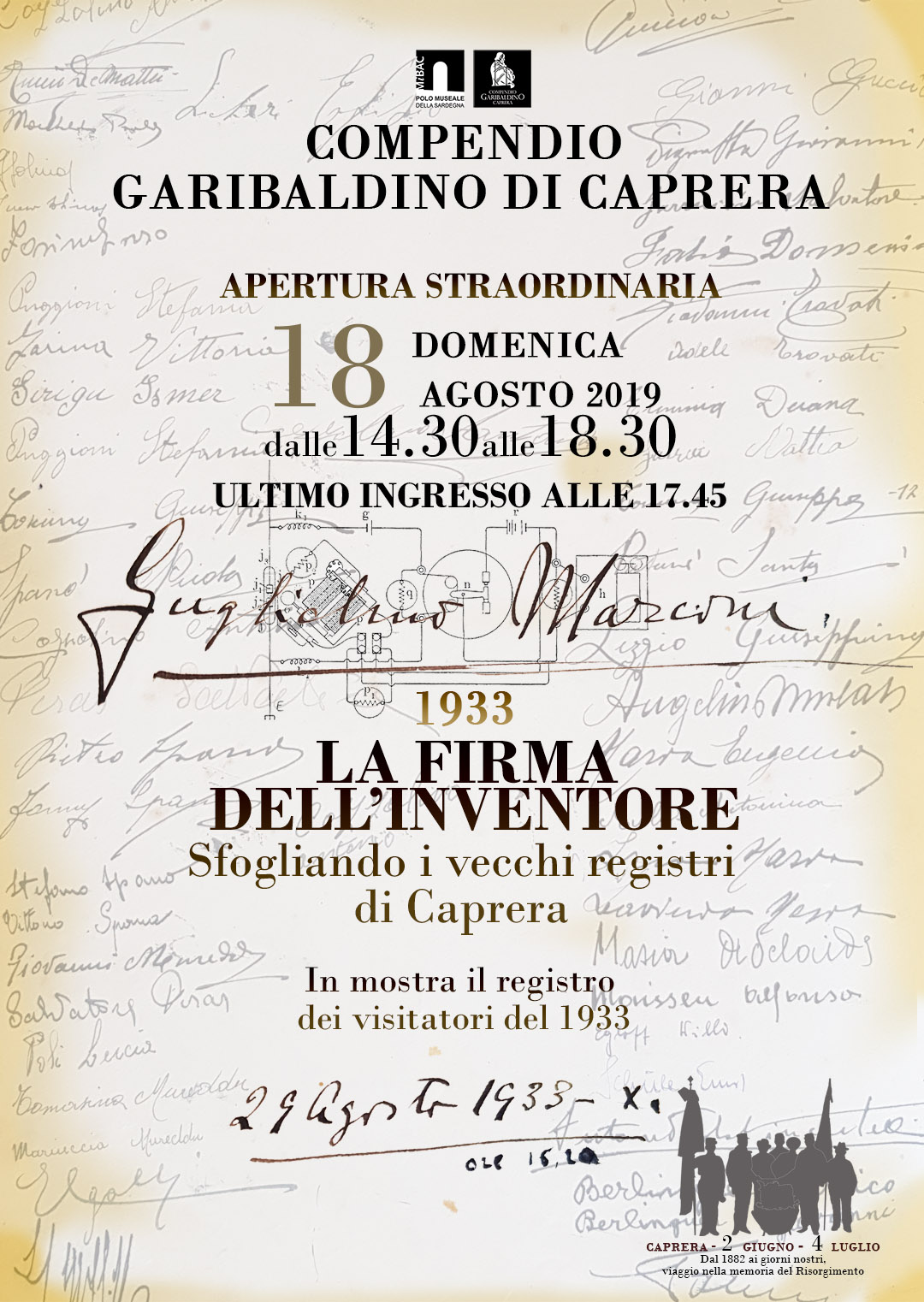 Un ponte “radio” tra passato e presente firmato da Guglielmo Marconi a Caprera. Domenica 18 agosto 2019, con apertura straordinaria dalle 14:30 alle 18:30, il Compendio Garibaldino di Caprera organizza una mostra dal titolo “1933 – La firma dell’Inventore. Sfogliando i vecchi registri di Caprera”. Per l’occasione verrà esposto il Registro dei visitatori con la firma autentica di uno dei più importanti scienziati del Novecento: Guglielmo Marconi.