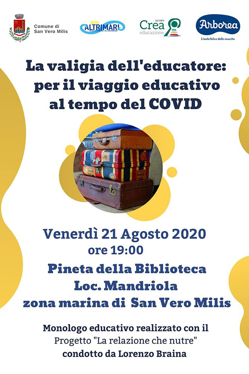 Il 21 agosto alle 19:00 nella pineta di Mandriola torna gradito ospite il pedagogista Lorenzo Braina anima e mente del centro CREA educazione. Ci introdurrà al progetto “La relazione che nutre” con il monologo educativo “La valigia dell’educatore: per il viaggio educativo al tempo del Covid”, tema quanto mai di attualità.