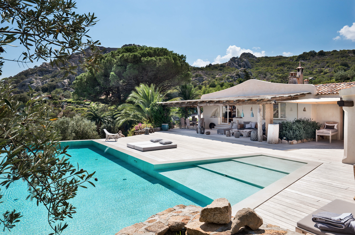 La piscina più scenografica: sul crinale di una collina di granito rosa, si erge la piscina con vista sull’insenatura dell’esclusiva Marina di Porto Cervo.