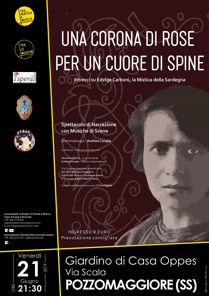 Venerdì 21 Giugno 2019 alle ore 21:30 a Pozzomaggiore (SS) nel Giardino di Casa Oppes (Via Scala) sarà proposto uno Spettacolo di Narrazione con Musiche e Canti dedicato alla Mistica della Sardegna, un dipinto sonoro sulla Beata Edvige Carboni. La performance vedrà in scena l’attrice Veronica Obinu, il musicista e compositore Andrea Congia (autore dell’Opera), e si avvarrà della partecipazione straordinaria del poeta Antoni Maria Pinna e del Coro di Pozzomaggiore guidato dal Maestro Giuseppe Serra. I Costumi e gli Allestimenti saranno curati dallo stilista Tore Oppes.