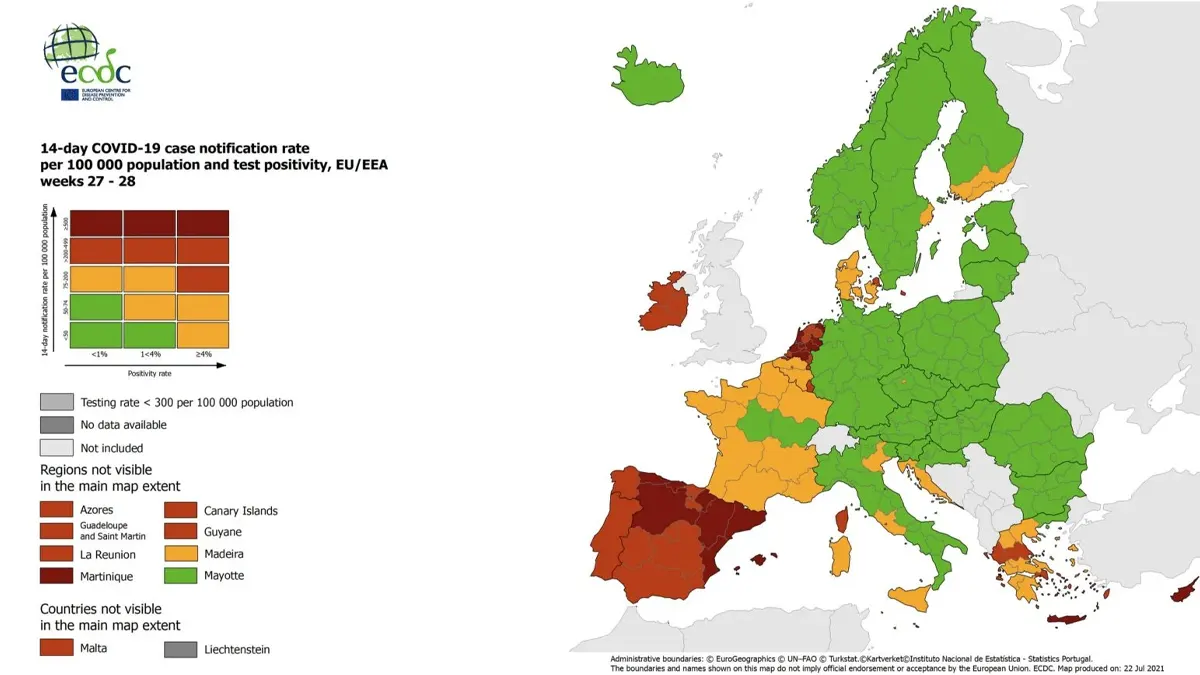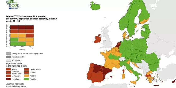 Lazio, Veneto, Sicilia e Sardegna in giallo insieme a gran parte della Francia e al Belgio. È quanto si evince dalla nuova mappa pubblicata oggi dal Centro europeo per la prevenzione e il controllo delle malattie (Ecdc).