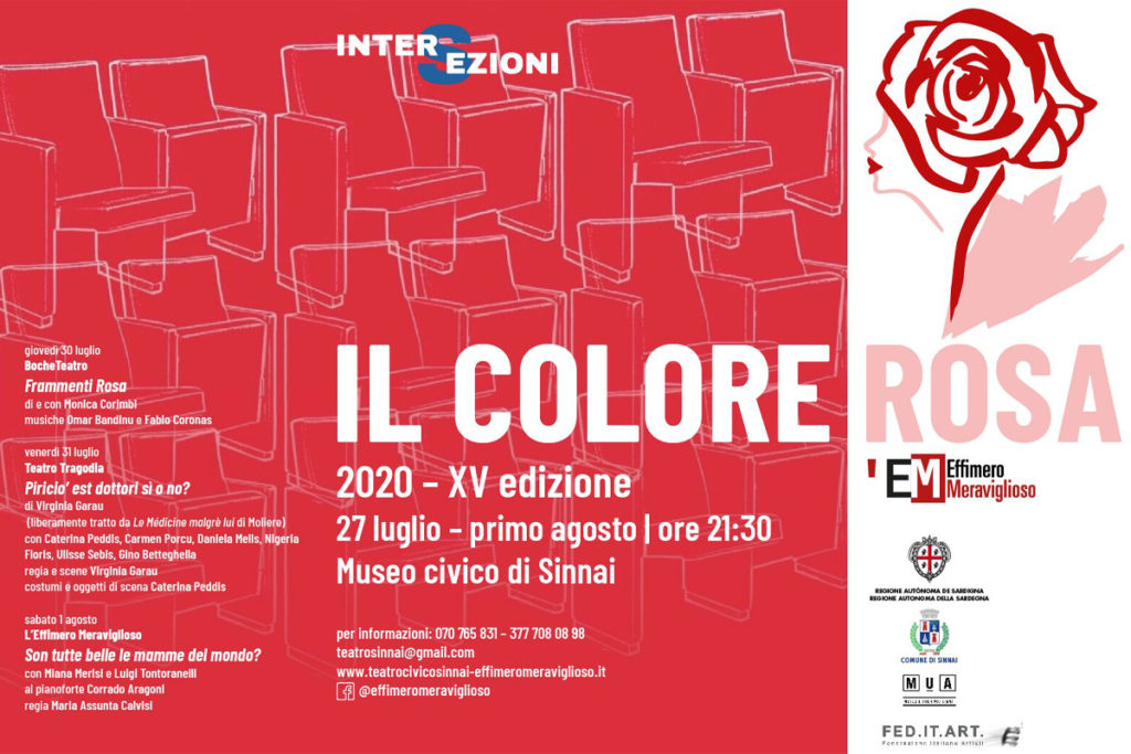 Teatro al Museo con la XV edizione del Festival “Il colore rosa” organizzato da L’Effimero Meraviglioso a Sinnai con la direzione artistica di Maria Assunta Calvisi, con il patrocinio e il sostegno del Comune di Sinnai – inserito nella rete di Intersezioni 2020 a cura di Fed.It.Art. Sardegna. Sei i titoli in cartellone da lunedì 27 luglio fino a sabato 1° agosto nella corte interna del Museo Civico di Sinnai per una “ripartenza” nel segno dell’arte e della cultura, con il debutto della nuova produzione dei “padroni di casa” accanto a pièces che affrontano le diverse forme e sfumature dell’amore ma anche il ruolo fondamentale della scienza nella società.