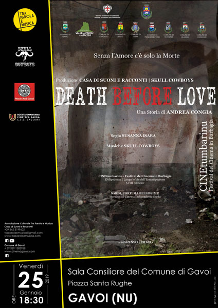 A quasi tre anni dall’inizio dei lavori del progetto cinematografico Death Before Love, la Casa di Suoni e Racconti e la band Skull Cowboys fanno tappa a Gavoi con il tour di presentazione del cortometraggio, frutto di una grande e articolata operazione artistica, organizzativa e di promozione del territorio. La presentazione del film si inserisce all’interno della serata dal titolo Sardi, Corti ma bellissimi, parte della sessione autunno-inverno della XVIII edizione di CINEtumbarinu – Festival del Cinema in Barbagia, fissata Venerdì 25 Gennaio 2019 a partire dalle ore 18:30 presso la Sala Consiliare del Comune di Gavoi (Piazza Santa Rughe). L’appuntamento in programma prevederà inoltre la partecipazione di diversi Autori e Registi e la proiezione di opere filmiche del panorama cinematografico indipendente sardo (Border di Paolo Zucca, Maialetto della Nurra di Marco Antonio Pani, Warlords di Francesco Pirisi, A casa mia di Mario Piredda, La finestra di Silvia Perra).