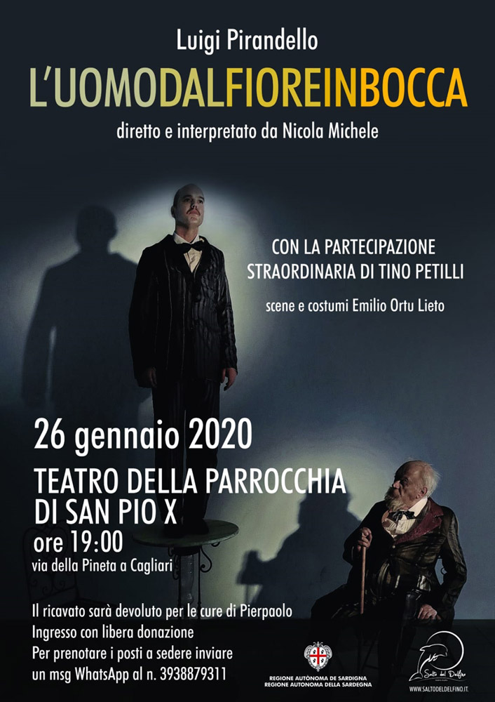 Saranno ancora una volta gli spazi di Villa de Villa a Dolianova a fare da scenario a una importante iniziativa promossa dalla Cooperativa Salto del Delfino: domenica 26 gennaio, infatti, andrà in scena una duplice rappresentazione de “L’uomo dal fiore in bocca”, tratta dal testo di Pirandello con in scena Nicola Michele (nel ruolo di attore e regista) e la straordinaria partecipazione dell’attore Tino Petilli. Le scene e i costumi sono curati da Emilio Ortu Lieto, la sartoria da Cinzia Moro, con la collaborazione della modellista Anna Floris, le luci e l’audio di Emanuele Mocci e le fotografie di scena di Giorgio Russo. Le recite andranno in scena alle ore 18 e alle ore 20:30.