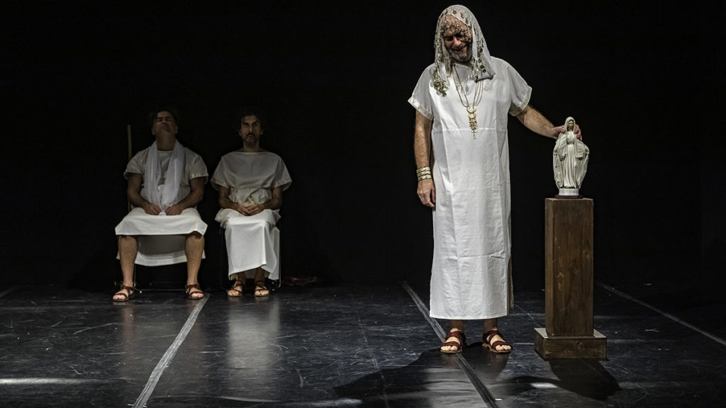 “Andromaca” – nella versione di Massimiliano Civica e I Sacchi di Sabbia mette in risalto il lato comico sotteso alla tragedia, oltre all’ironia implicita di quell’adoperarsi e affannarsi per mutare un destino già scritto da parte dei personaggi ignari della propria sorte e comunque in balia dei capricci degli dei. Euripide è forse il più “laico” tra gli autori greci, nelle sue opere vi è una peculiare attenzione alla psicologia e al realismo, le situazioni vengono spesso spinte all’estremo finché l’intervento di un “deus ex machina” interviene a risolvere il dilemma e riportare l’armonia.