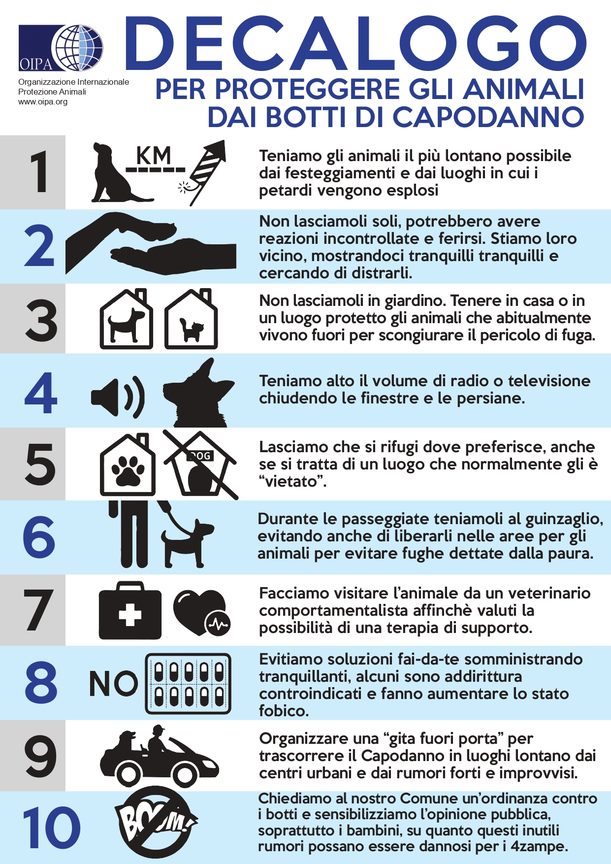 Gli ultimi giorni dell’anno sono interessati da una grande apprensione per i danni che faranno i botti di Capodanno, causando feriti e vittime tra uomini e animali. Anche quest’anno l’OIPA (Organizzazione Internazionale Protezione Animali) ha iniziato la diffusione del decalogo con le indicazioni per affrontare al meglio il problema, dando utili e pratici consigli per proteggere i propri amici a 4 zampe, come non lasciarli in giardino e tenere alto il volume della televisione per attutire i rumori provenienti dall’esterno.