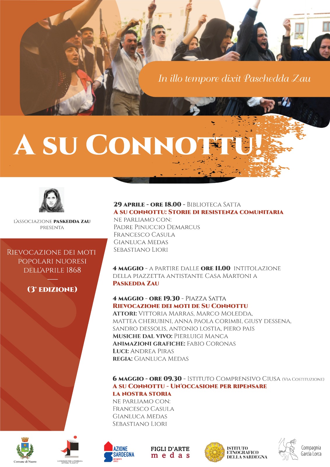 Sabato 4 maggio, invece, dopo l’intitolazione della piazzetta antistante Casa Martoni a Paskedda Zau (ore 11), Gianluca Medas sarà regista e narratore principale dello spettacolo teatrale, musicale e visivo “Rievocazione dei moti de Su Connottu”, che si terrà in piazza Satta alle 19.30. Si tratta di una narrazione civile, che racconta i fatti nuoresi dell’aprile 1868 partendo dalle sue origini: la politica che i Savoia attuarono in Sardegna. Per riscrivere la storia di Paskedda Zau, Medas si è affidato anche agli appunti di Michele Pintore, studioso nuorese. Suddiviso in tre momenti principali, l’esibizione si avvale di parti recitate, narrate e cantate. Gianluca Medas sarà il narratore principale della vicenda, dall’arrivo dei piemontesi a oggi. Farà uso di testi propri, altri tratti da “Procurade ’e moderare”, letture del nuorese Romano Ruju (che per primo rappresentò i fatti di Su Connottu) e poesie di Francesco Masala. Entreranno poi in scena gli attori Vittoria Marras e Marco Moledda, rispettivamente nelle vesti di Paskedda Zau e Salvatore Rubeddu. Gli altri attori della compagnia teatrale Garcia Lorca – Mattea Cherubini, Anna Paola Corimbi, Giusy Dessena, Sandro Dessolis, Antonio Lostia, Piero Pais- daranno vita a uno spettacolo in forma laica con gli stilemi della tragedia greca, formando, appunto, una sorta di coro greco. Tra le luci di Andrea Piras e il contrabbasso di Pierluigi Manca, la serata sarà ancora dipinta dai disegni live su iPad, proiettati sul muro, a cura di Fabio Coronas. Grazie a un’app di ultima generazione, si darà identità visiva ai vari momenti, con l’uso della live art animation, animazioni grafiche create sul momento.