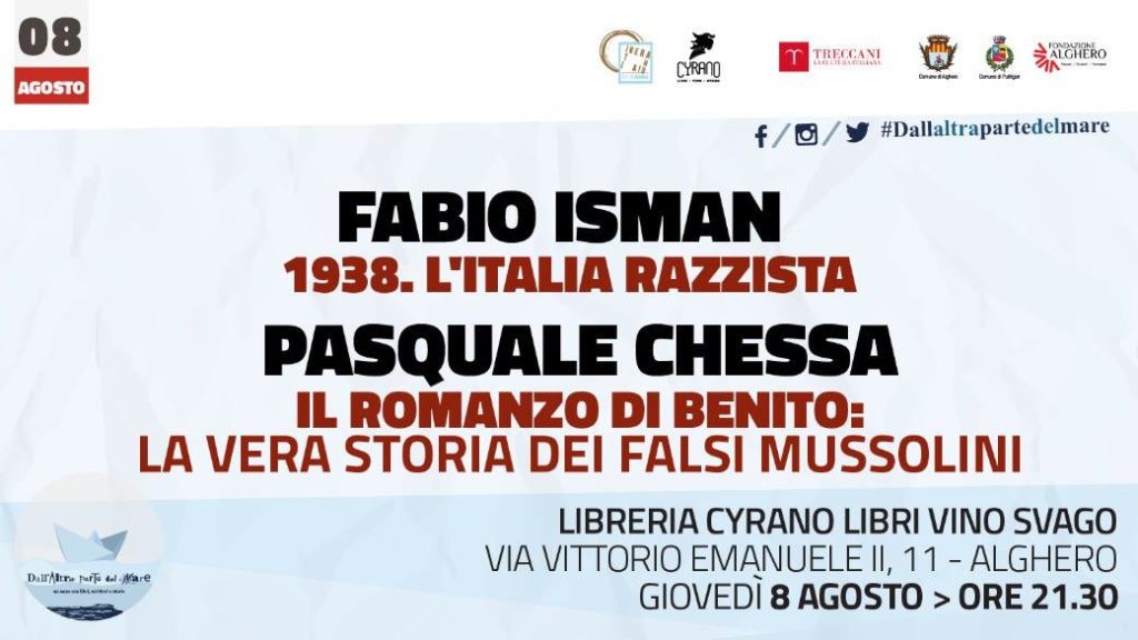 Giovedì 8 agosto Pasquale Chessa e Fabio Isman saranno i protagonisti di una nuova anteprima del festival Dall’altra parte del mare. Alle 21:30, nello spazio all’aperto della Libreria Cyrano, partendo dai loro ultimi libri, “1938. L’Italia razzista (F. Isman – Il mulino) e “Il romanzo di Benito: La vera storia dei falsi Mussolini” (P. Chessa – Utet) converseranno di due tra i momenti più difficili e controversi della storia d’Italia.