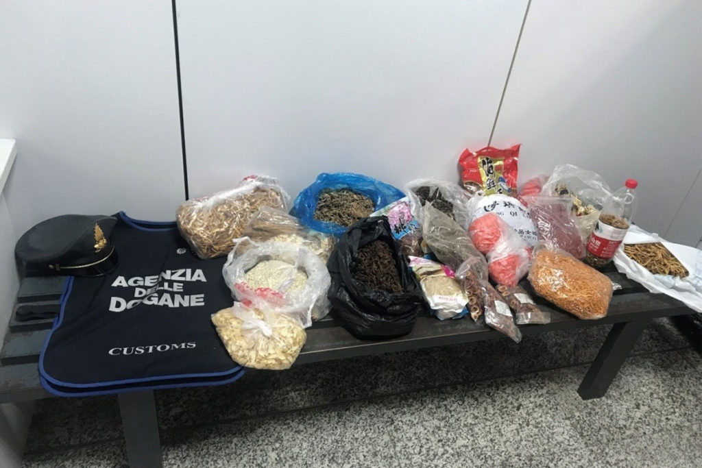 I prodotti erano nel bagaglio a mano di un passeggero di nazionalità cinese, proveniente dalla Repubblica Popolare Cinese, via Roma Fiumicino.