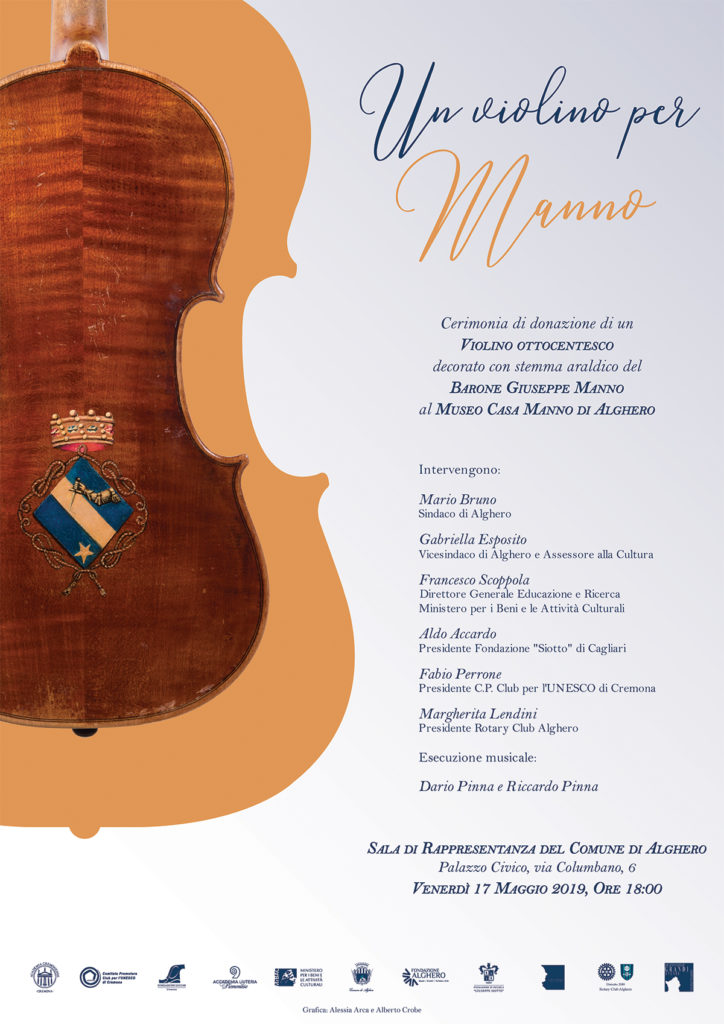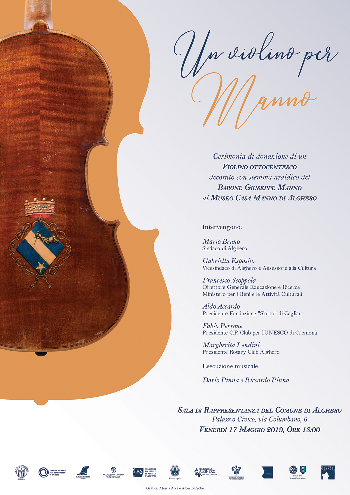 Venerdì 17 maggio alle ore 18,00 presso la Sala di rappresentanza del Comune di Alghero (Palazzo Civico, via Columbano n. 6) si terrà la cerimonia di donazione al museo Casa Manno di un violino ottocentesco decorato con lo stemma araldico del barone Giuseppe Manno.