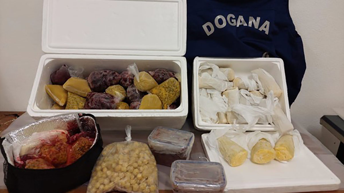 Alghero. Nell’ambito dell’attività antifrode svolta presso la sala arrivi internazionali dell’Aeroporto “Riviera del Corallo” di Alghero, i Funzionari dell’Agenzia Dogane e Monopoli (ADM) di Sassari, in servizio presso la Sezione Operativa Territoriale di Alghero in collaborazione con i militari della Guardia di Finanza della Compagnia di Alghero, hanno fermato e sottoposto a controllo una passeggera proveniente dall’Equador, via Roma Fiumicino, che deteneva nel bagaglio un collo del peso di una trentina di chilogrammi, costituito da prodotti alimentari in fase di decongelamento, di cui 27 kg di vegetali (mango, maracuja, naranjilla, foglie di guayusa) e 1,5 kg circa di formaggio, privi di etichettatura che ne attestasse l’origine e la specie, e di certificato fitosanitario.