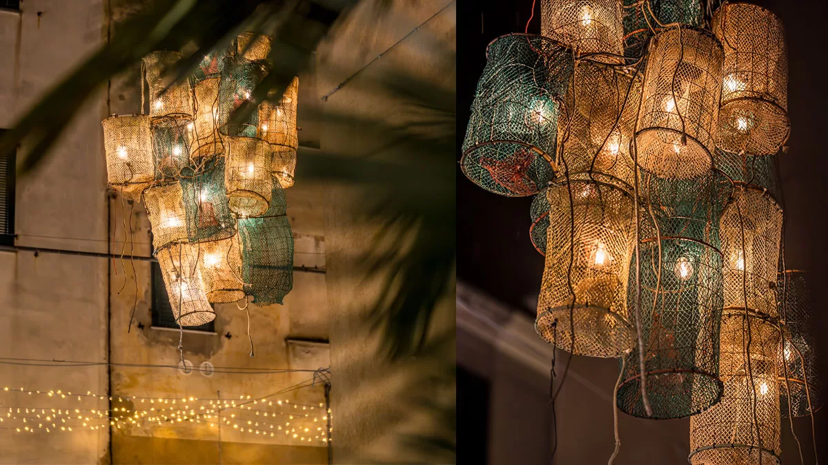 Il concept, firmato da Antonio Marras, parte dall’idea di trasformare la nassa da strumento di cattura a telaio narrativo. La rete, simbolo di attesa e di lavoro, si illumina e disegna nell’aria geometrie di ombre e riflessi, restituendo un paesaggio visivo che unisce artigianato e ricerca artistica. All’interno di ogni nassa sono custoditi frammenti di corallo, non come oggetti di valore commerciale, ma come tracce materiche del fondo marino. L’opera propone così un dialogo tra la manualità umana e la biologia sottomarina, dove la luce diventa mezzo di connessione tra profondità e superficie.