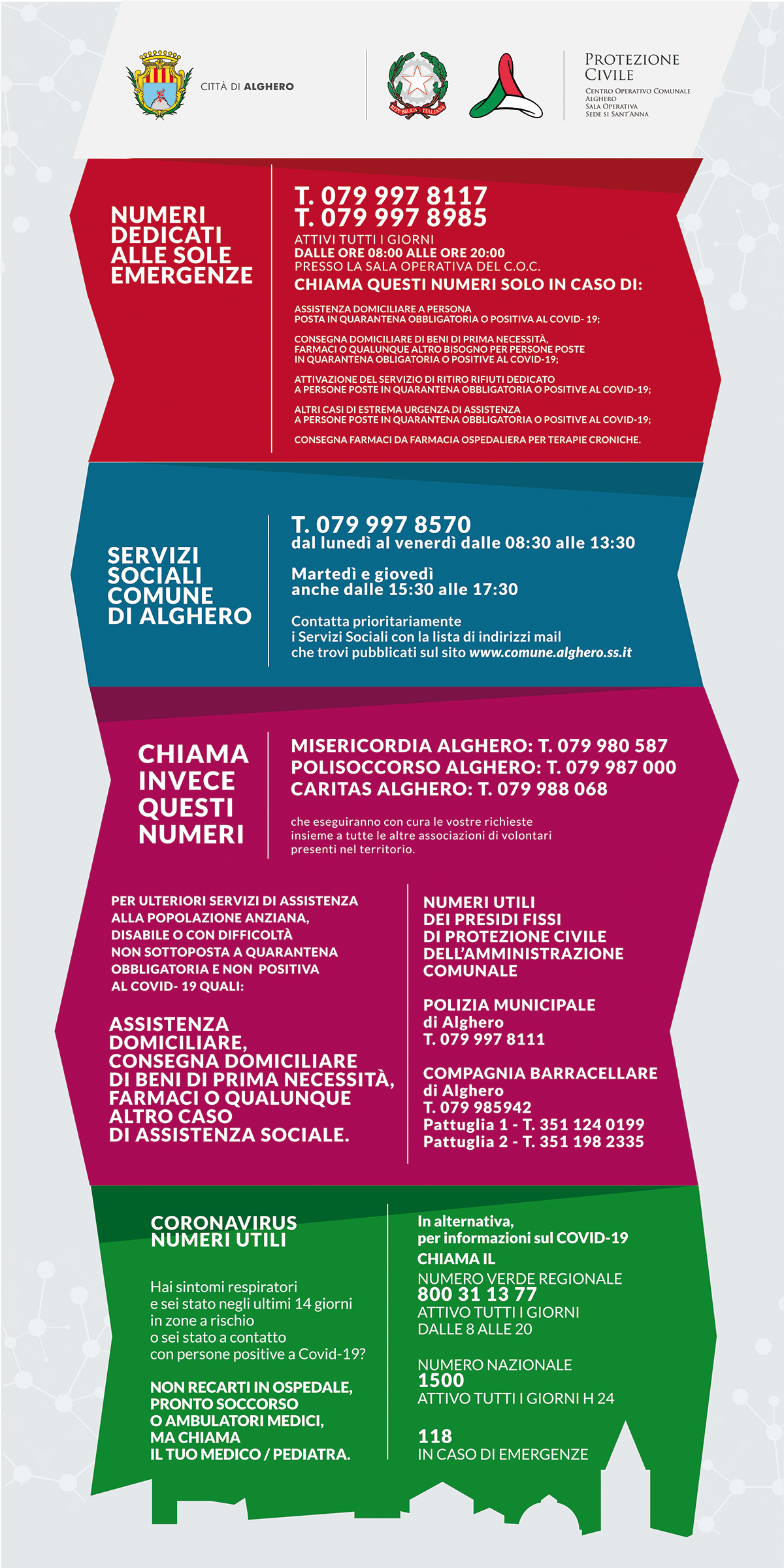 Per ulteriori servizi di assistenza alla popolazione anziana disabile o con difficoltà, non sottoposta a quarantena obbligatoria o positiva al COVID-19 (assistenza domiciliare, consegna domiciliare beni di prima necessità, farmaci o qualunque altro caso di assistenza): Misericordia Alghero 079 980587; Polisoccorso Alghero 079 987000; Caritas Alghero 079 988068 (elaborazione delle richieste congiuntamente a tutte le altre associazioni di volontari presenti nel territorio).