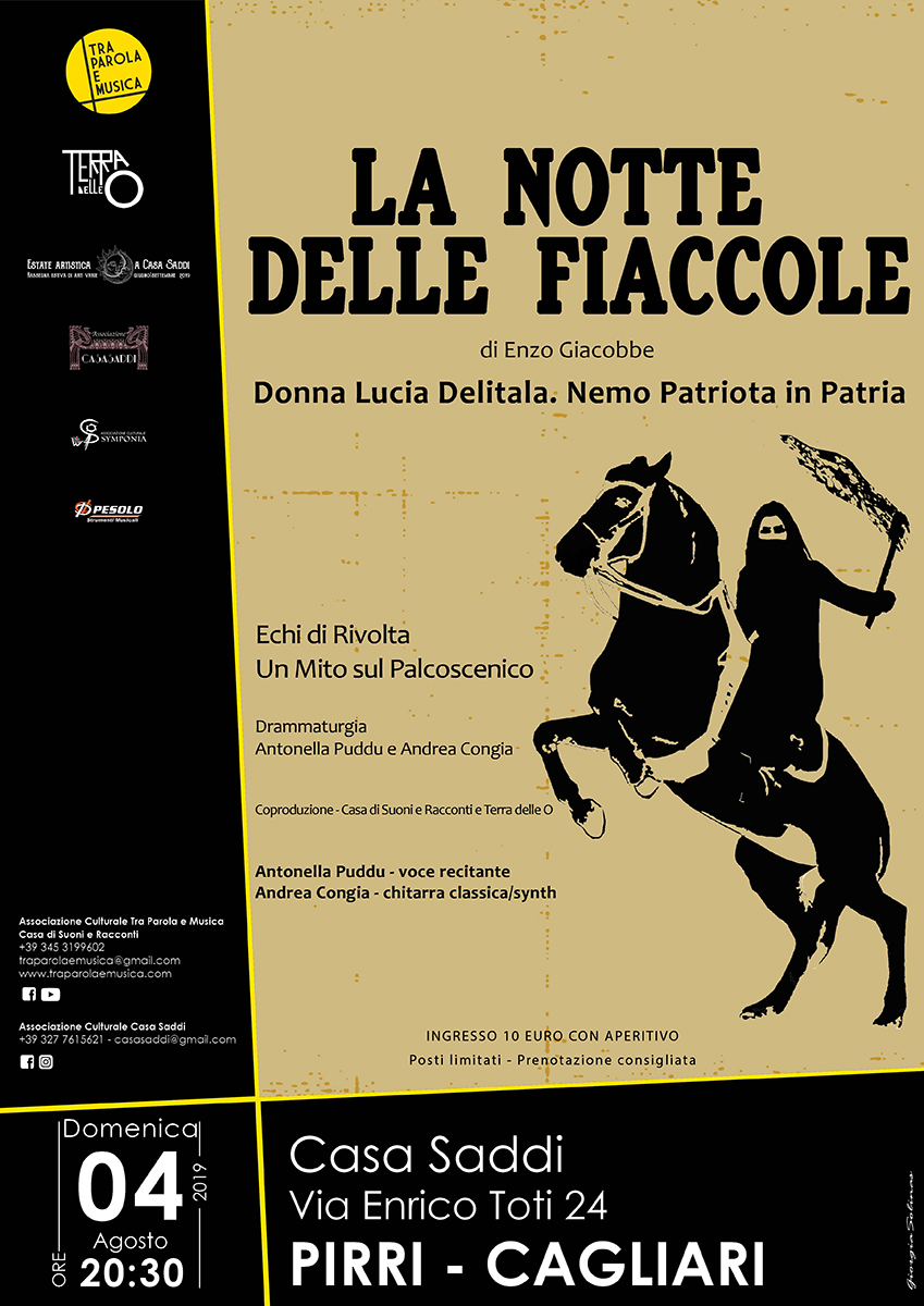 In occasione della Rassegna Estiva di Arti Varie organizzata dall’Associazione Culturale Casa Saddi, la Casa di Suoni e Racconti e Terra delle O portano in scena lo spettacolo tratto dal testo dello scrittore e drammaturgo Enzo Giacobbe, La Notte delle Fiaccole. L’appuntamento è previsto per domenica 4 agosto 2019, alle ore 20:30, nella suggestiva cornice del cortile di Casa Saddi a Cagliari (Via Enrico Toti 24 – Pirri). Tra Parola e Musica la voce dell’attrice Antonella Puddu e le musiche della chitarra di Andrea Congia (che firmano anche la drammaturgia dello spettacolo) condurranno un gioco musico-teatrale per delineare i mille volti di Donna Lucia Delitala. Screditata, temuta e al tempo stesso ammirata, la Nobildonna Sarda è divenuta leggenda con il soprannome di Amazzone di Nulvi. Nella profonda metamorfosi politico-sociale che ha caratterizzato la Sardegna del Settecento, la Banditessa a cavallo è passata alla Storia con innumerevoli identità date dalle diverse letture della sua figura di Donna Guerriero. Una profonda riflessione sui concetti di Eroe, Bandito, Ribellione e Libertà.