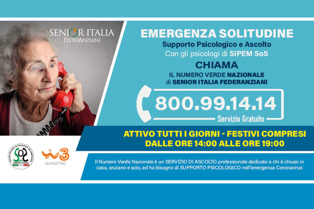 Dopo le numerose chiamate ricevute durante ilprimo periodo del lockdown, il numero verde di Senior Italia FederAnziani, WINDTRE e SIPEM SoS Federazione, la Società Italiana di Psicologia dell’Emergenza, nato all’inizio della pandemia per supportare gli anziani soli, è di nuovo attivo. Il servizio continuerà, pertanto, ad offrire aiuto a coloro che abbiano bisogno di ascolto e sostegno psicologico in questo prolungato periodo di isolamento.
