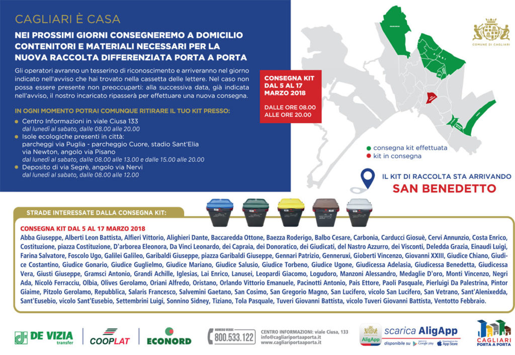 Fra poco meno di due settimane sarà completata la distribuzione il kit per il nuovo sistema di raccolta differenziata dei rifiuti a San Benedetto. Come già avvenuto in altre zone della città, tutti i cittadini coinvolti nel porta a porta entro sabato 17 marzo 2018 riceveranno i contenitori e i materiali utili direttamente a casa propria.